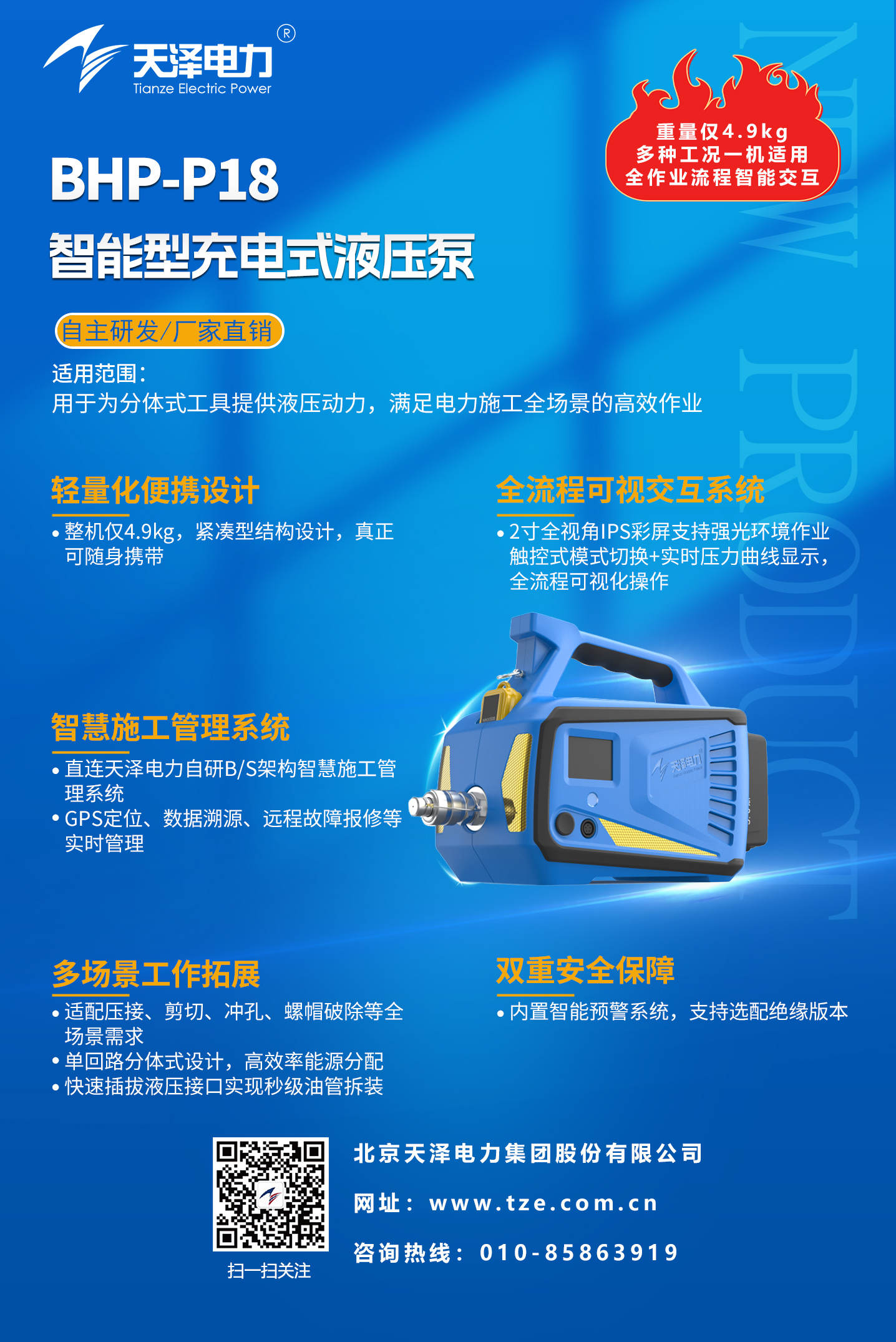 近年来,随着工业自动化水平的提高,液压泵的技术也在不断进步,天泽电力采用高效节能的驱动方式、优化内部结构设计以提高工作效率,本次推荐的智能型充电式液压泵bhp-p18具备高液压、小型化、轻量化、智能化特点,满足不同应用场景的需求,尤其是高空作业。此外,随着对环保和能效的关注,bhp-p18的设计越来越注重降低能耗和减少噪音!