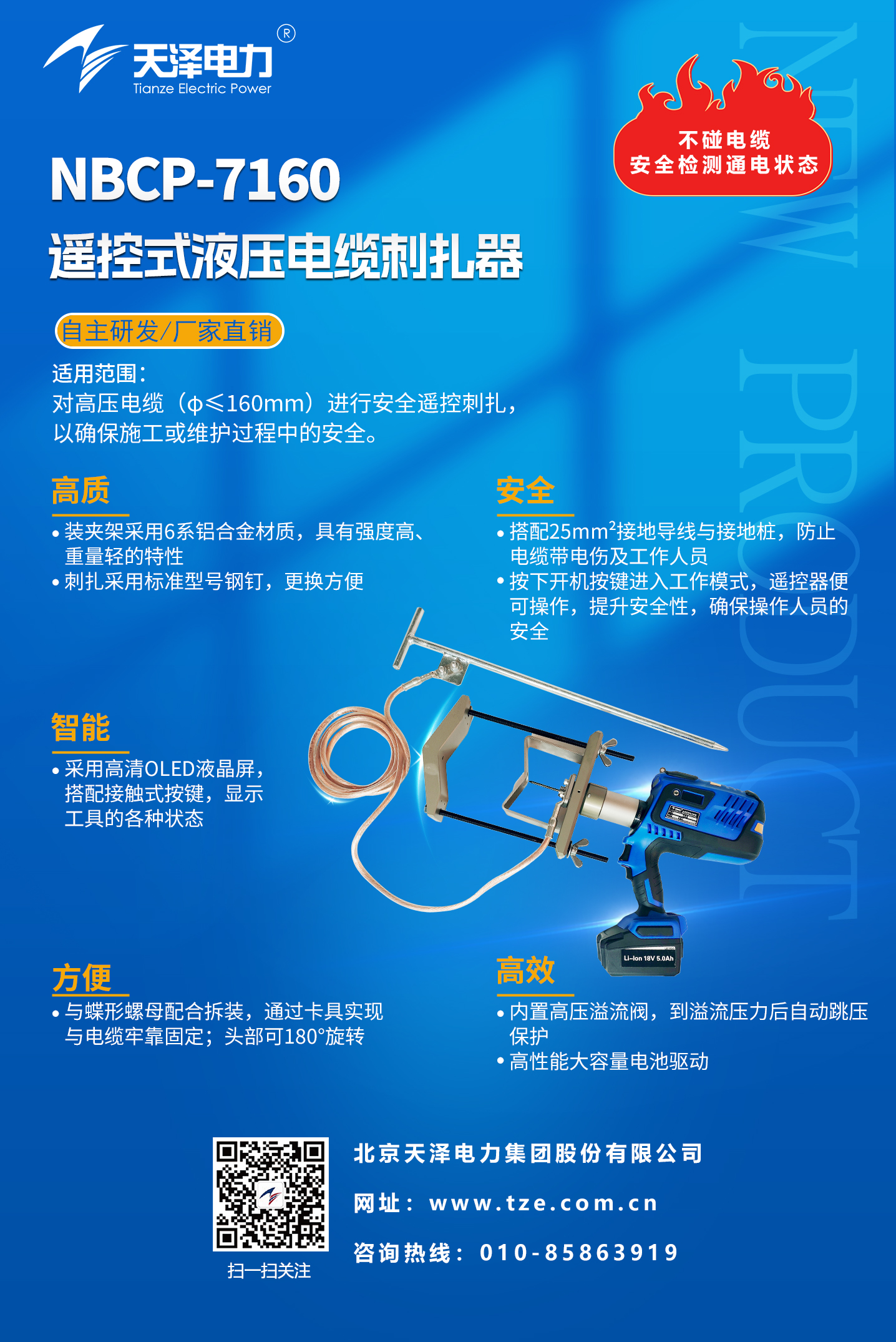 天泽电力通过不断对行业痛点与行业难题的研究,根据《电业安全工作规程(电力线路部分)》及用户的实际需求,突破技术瓶颈,自主研制出新一代遥控式液压电缆刺扎器nbcp-7160。该产品解决了传统行业难题,凭借结构轻巧,固定方便,可多角度调节,远程遥控,锂电驱动等多项产品优势,深受广大用户信赖,成为电力电缆施工与维护工作中的可靠工具,确保设备安全、人员安全!