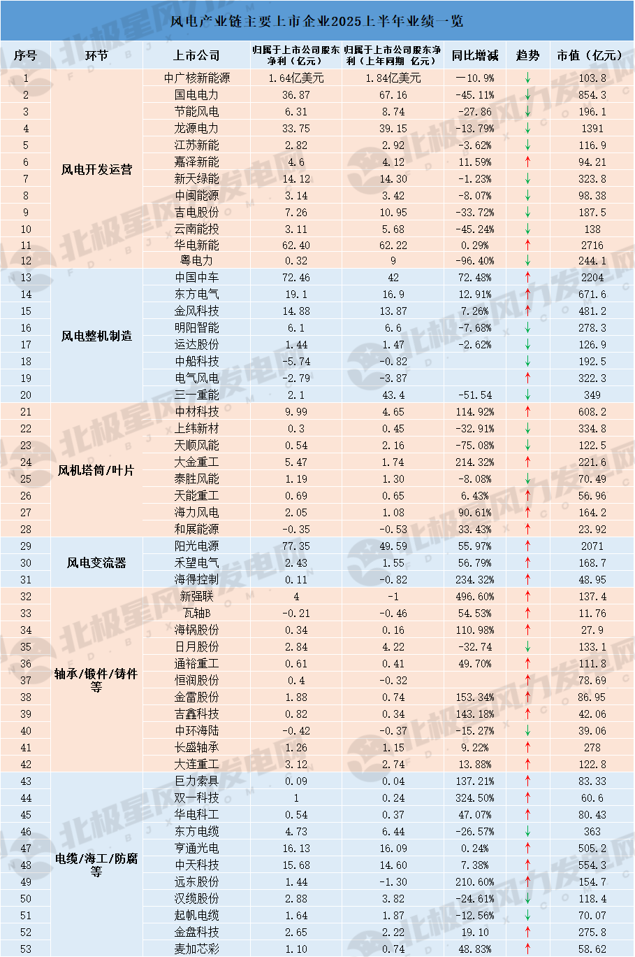 据北极星风力发电网统计,上半年虽大部分风电上市企业业绩表现不俗,但产业链上中下游呈现出明显的两极分化趋势。政策推进下的行业需求回暖带动了整体产业链的繁荣,但在技术迭代加速、市场竞争激烈的背景下,上游企业业绩爆发特征显著,中游制造业仍处于较为挣扎的状态,下游开发商集中亏损的现象则相对明显——这一格局既体现出风电产业对风资源的依赖,也反映出电价政策对新能源运营的深刻影响。