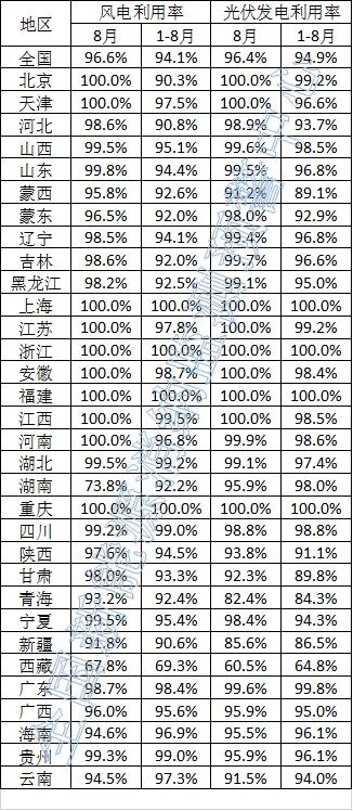 1-8月,全国风电利用率为94.1%,光伏发电利用率为94.9%。